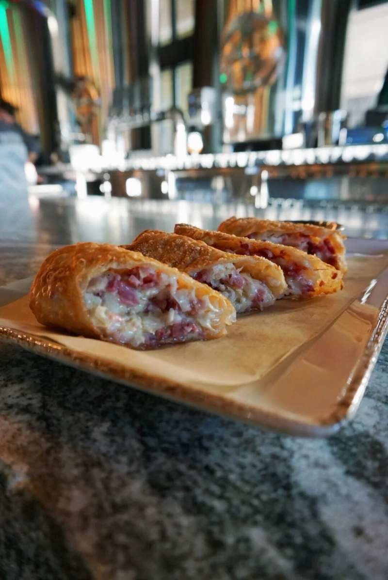 Let's begin with the crispy corned beef egg rolls. They are egg rolls filled with crispy corned beef (duh.), as well as sauerkraut and Swiss cheese. While I am not usually a huge Sauerkraut fan - these were honestly so good I almost ate them all before I could snap this shot for you guys. These yummy egg rolls are served with a creamy Sriracha sauce.